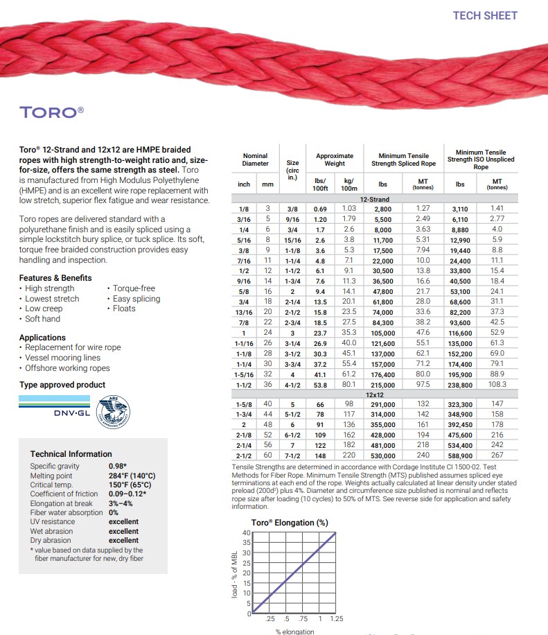 ropes with high strength-to-weight ratio and, sizefor-size, offers the same strength as steel. Toro
